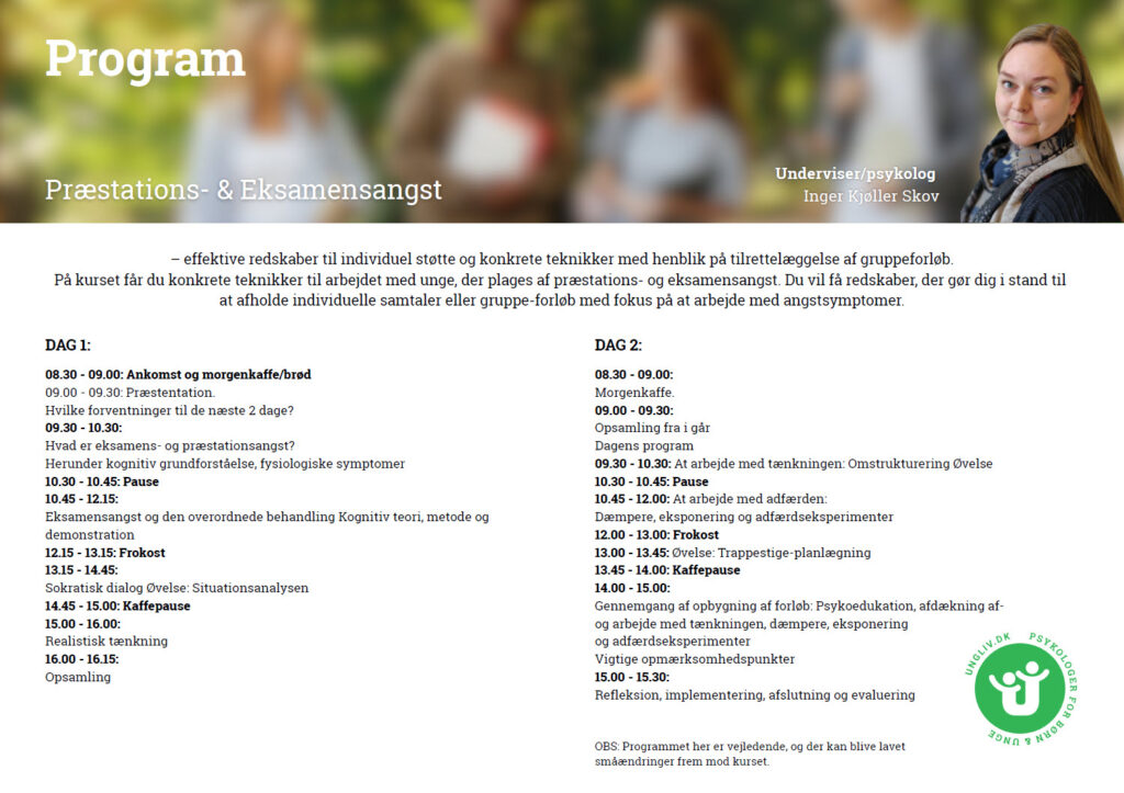| 09.30 – 10.30 | Hvad er eksamens- og præstationsangst? Herunder kognitiv grundforståelse, fysiologiske symptomer |