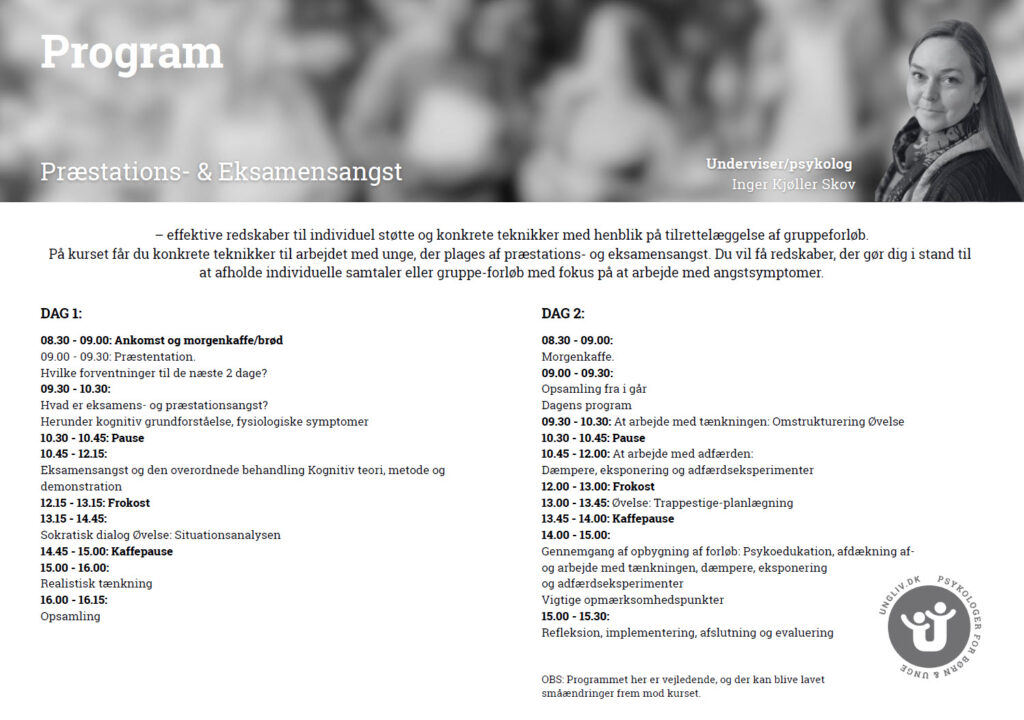 | 10.45 – 12.15 | Eksamensangst og den overordnede behandling Kognitiv teori, metode og demonstration |