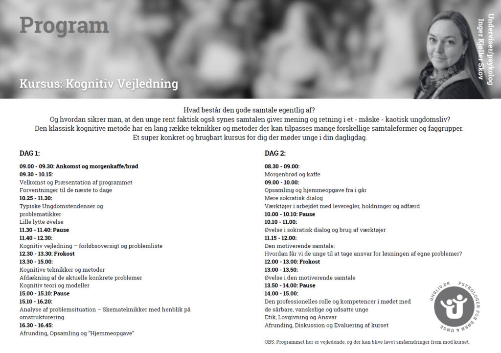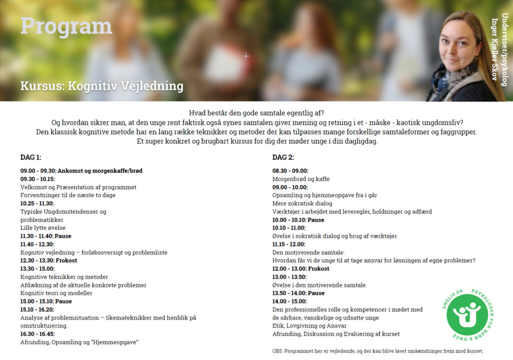 Typiske ungdomstendenser. Optimering af samtalen med den unge, også når tiden er knap. Ansvar, lovgivning og etik. Kognitiv teori og grundteknikker, herunder situationsanalyse, sokratisk dialog, skemabrug, motiverende samtale og meget mere.